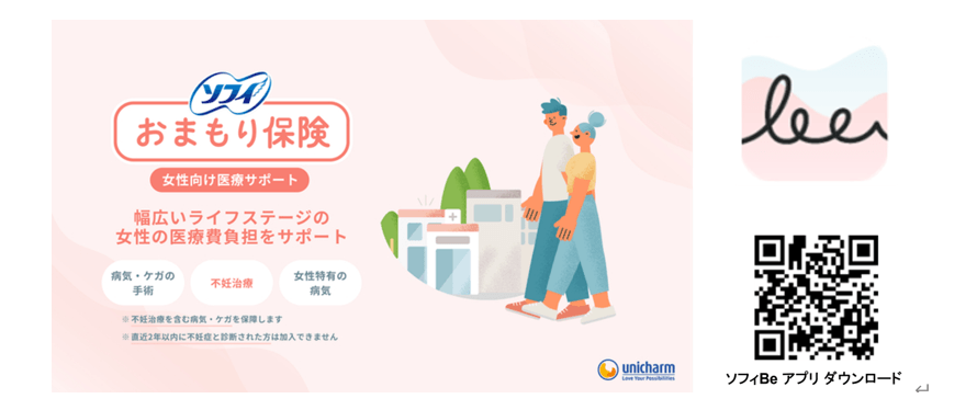 ユニ・チャーム株式会社(代表取締役 社長執行役員:高原 豪久)は、生理管理アプリ『ソフィBe』から申し込み可能な、少額短期保険「ソフィ おまもり保険 女性向け医療サポート」(引受少額短期保険業者:アフラック少額短期保険株式会社)の取り扱いを、2024年11月26日より開始することをお知らせします。