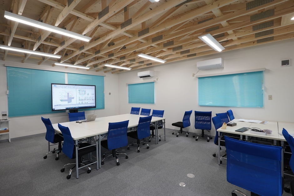 奥山倉庫プラスワンは、木造在来工法+小屋組トラスで建設され、独自の設計ポイントが盛り込まれたローコストで機能的かつスッキリとした室内空間が実現しています。また、セミナールームには、若手社員教育用や先輩社員からの説明用に図面上でしか見たことがないものを実物で見られて理解できるようにモックアップを設置しています。