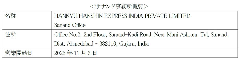 阪急阪神エクスプレス(本社:大阪市北区 代表取締役社長:谷村 和宏)のインド法人である HANKYU HANSHIN EXPRESS INDIA PRIVATE LIMITED(本社:デリー)は、インド西部のアーメダバード市近郊のサナンドに新たに事務所を開設し、11月3日より業務を開始します。