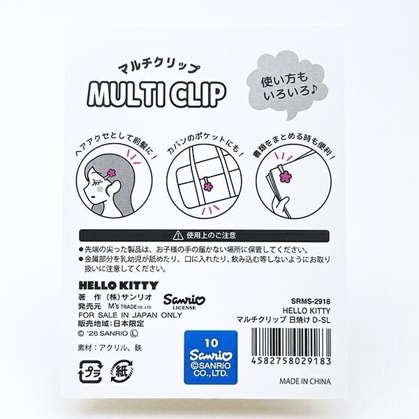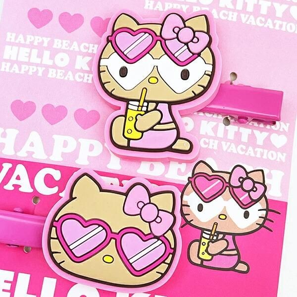 前髪を止めるだけではなっく、バッグにつけてアクセントにしたり、ノートのクリップとしてもお使いいただけます。つけたところに日焼けキティがちょこんと見えて映えそうです。【サイズ】全身:4cm×4.5cm、フェイス:3cm×5.1cm 素材:アクリル、鉄