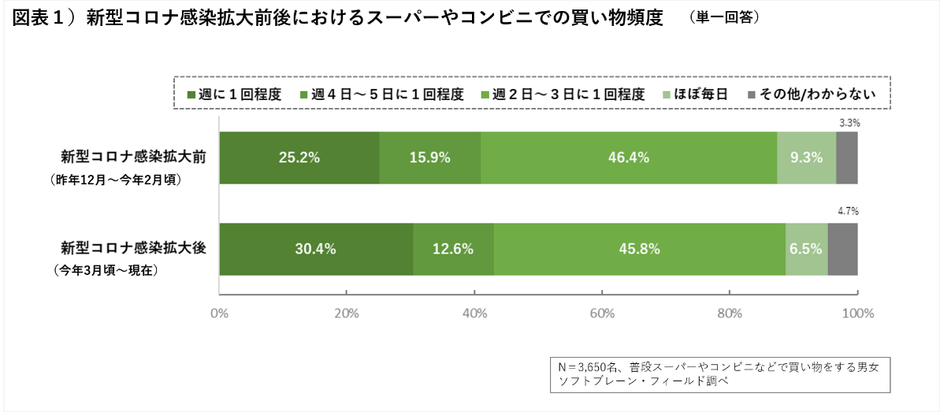 まず最初に、新型コロナ感染拡大前(昨年12月~今年2月頃)と、感染拡大後(今年3月頃~現在)におけるスーパーやコンビニなど買い物頻度の変化を確認するためにアンケート調査を実施しました。(N=3,650名、20代~60代男女、2020年7月実施「買い物行動に関するアンケートより」)