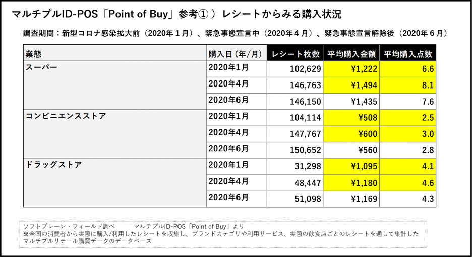 フィールド・クラウドソーシング事業を展開するソフトブレーン・フィールド株式会社(本社:東京都港区、代表取締役社長:木名瀬博)は、全国のアンケートモニターから独自に収集する「マルチプルID-POS購買理由データPoint of Buy(R)」から、新型コロナ感染拡大前(2020年1月)、緊急事態宣言中(2020年4月)、緊急事態宣言解除後(2020年6月)における買い物行動の変化を分析しました。(2020年1月、4月、6月の購入レシート枚数は814,942枚)