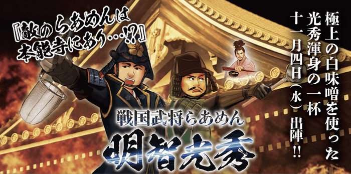今回登場する一杯は、【戦場で『旨いらあめん』を兵士たちに振る舞い、鋭気を養ってもらうことが、戦国武将達の『ステータス』になっていた】という設定のもと、明智光秀が京都の食材を用いて作ったラーメンを開発し、ラーメンバトルに挑むというオリジナルストーリーを創作。ラーメンとエンターテイメントを融合させた一杯です。