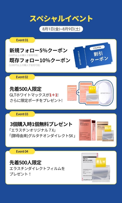 このたび2025年8月1日(金)から8月9日(土)まで開催されるQoo10メガポではGLTホワイトマックスが1+1からの限定ポーチ付きセット、そして、エラスチンゼリーとグルタチオン5Xフィルムが3個購入時1個無料で貰えるイベントを開催します。メガポ限定セールでお得に購入して、この夏、新しいあなたに生まれ変わりましょう!その他、豪華なイベントも開催予定ですので、この機会をお見逃しなく!一緒に素敵な夏を楽しみましょう!