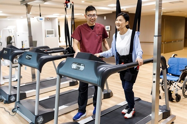 ※1:ポラリスが開発した機器で、歩行訓練を3人同時に実施でき、安全装置により転倒リスクゼロを実現しています。最大50%の免荷を行うことができ、重度のご入居者様でも歩行訓練の実施が可能になります。