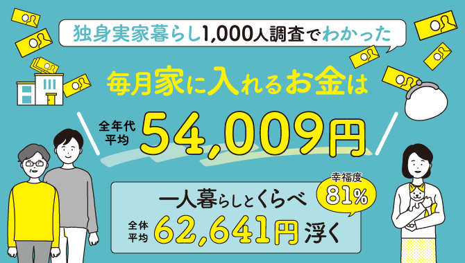 実家暮らしをしている社会人(独身者)1,000人調査の結果、毎月家にお金を入れるひとは全体の61%で、全年代平均額は54,009円でした。