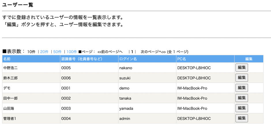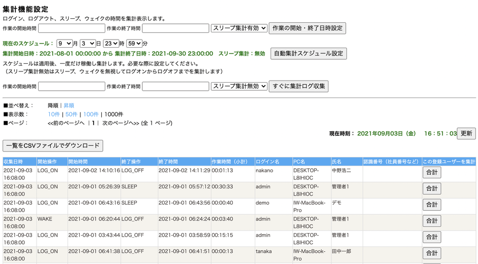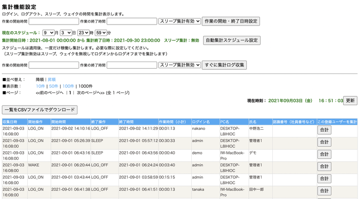 これにより、従業員の稼働時間を計算することができ「タイムカード」の代わりに作業報告が可能。認識番号(社員番号)でパソコンやログインユーザーを登録可能、ユーザー毎に表示されたレポートはCSVとして出力でき、管理者は出勤台帳を作成することができます。