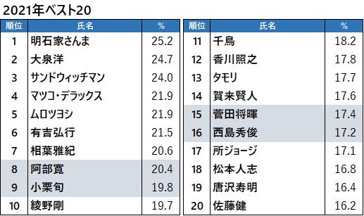2021年男性タレントベスト20(図1)をみると、明石家さんま 25.2%、大泉洋 24.7%、サンドウィッチマン 24.0%がトップ3となりました。