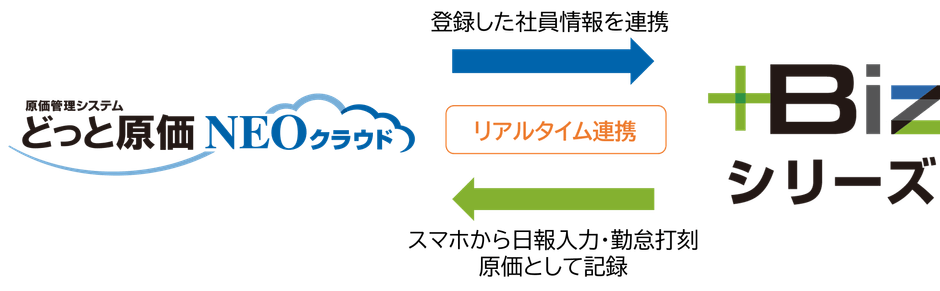 +Bizシリーズは建設業の業務改善やIT化を進め、より容易に原価管理を行うことで、経営改善をサポートすることを目的に企画・開発されました。どっと原価NEOクラウドへ登録した社員や現場の情報を連携させ、スマートフォンから入力した情報をリアルタイムで勤怠情報・原価情報として取り込みます。