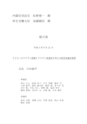 参加した議員たちは提言書の趣旨に賛同し、内容についても積極的に意見を出し合いました。そして、無事に議員連盟としての提言書がまとまり、早急に松野内閣官房長官と加藤厚生労働大臣に手交することを確認しました。河村たかし名古屋市長と、南出賢一泉大津市長もリモートで総会に参加し、実際に市内でワクチン後遺症で苦しむ方々の現状などを訴えました。提言書は以下の4枚で構成されています。