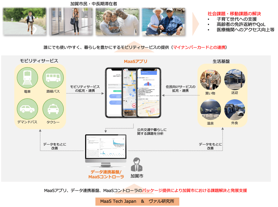 これら状況を踏まえ、MaaS Tech Japanのデータ連携基盤統合技術やそれを活用したMaaSの事業開発ノウハウと、ヴァル研究所がもつ経路検索エンジン技術などの強みを持ち寄り、加賀市における「誰でも使いやすく、暮らしを豊かにするモビリティサービス」を実現するため、本協定を締結いたしました。