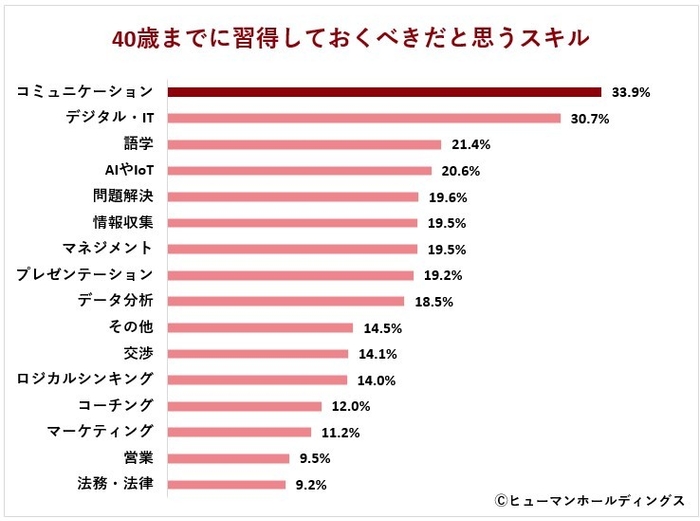 ●「40歳までに習得しておくべきスキル」は、1位「コミュニケーション」、2位「デジタル・IT」、3位「語学」