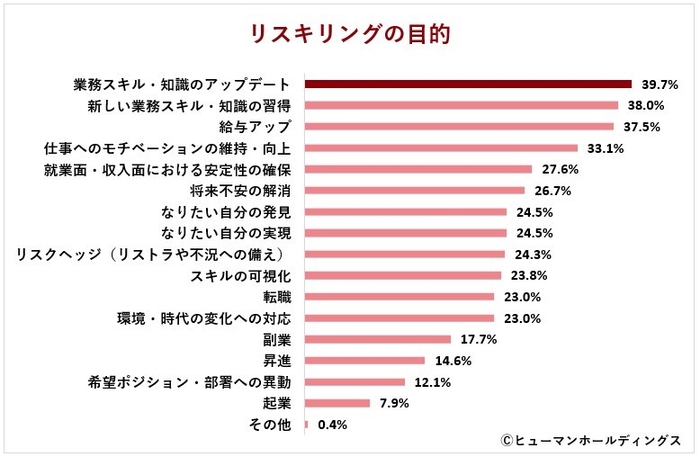 「リスキリングに取り組んだことがある」と回答したのは23.2%でした。取り組んだことがある、また取り組みたいと思っている453名にリスキリングの目的について聞いたところ(複数回答可)、「業務スキル・知識のアップデート(39.7%)」「新しい業務スキル・知識の習得(38.0%)」「給与アップ(37.5%)」という理由が多く挙げられました。最新のスキルや知識を得て業務に活かしたり、給与アップのためにリスキリングを行うことが多く、また、Q2の「仕事に関する悩み」では「モチベーションが上がらない」が2番目に多い結果でしたが、リスキリングが「仕事へのモチベーション維持・向上」(33.1%)」に繋がる状況も垣間見えます。
