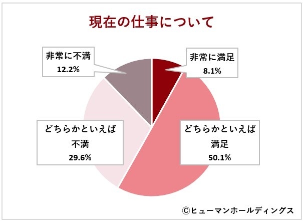 「現在の仕事に就いて満足しているか」という質問には58.2%と、半数以上が「満足している」と回答しています(「非常に満足(8.1%)」と「どちらかといえば満足(50.1%)」の合計値)。