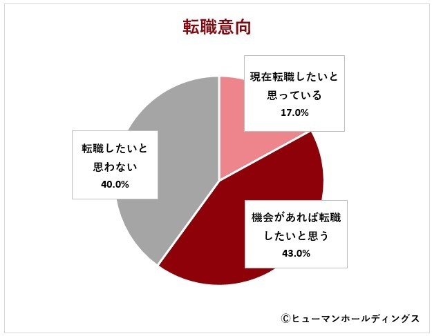 「転職をした経験(1~5回)がある」と回答したのは、62.6%でした。また、「転職の意向がある」人も60.0%(「現在転職をしたいと思っている(17.0%)」と「機会があれば転職したいと思っている(43.0%)」の合計値)にのぼり、40代での転職を考える人は多くいることがわかりました。