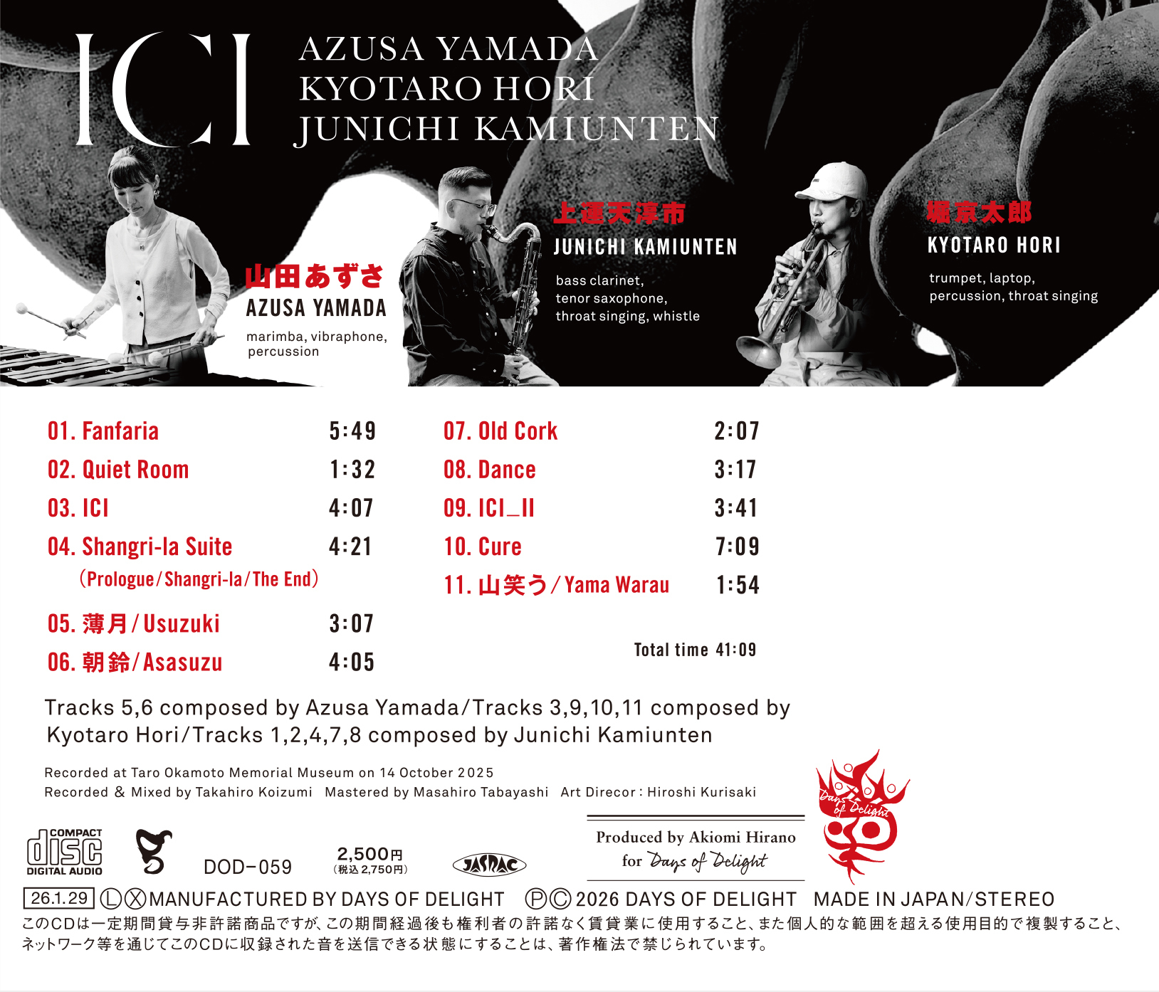 日本ジャズの新たなプラットフォームDays of Delight(ファウンダー&プロデューサー:平野暁臣)は、個性的なプレイで異才を放つ3人のスペシャリスト、山田あずさ・堀京太郎・上運天淳市による新譜『ICI』を2026年1月29日に発売します。
