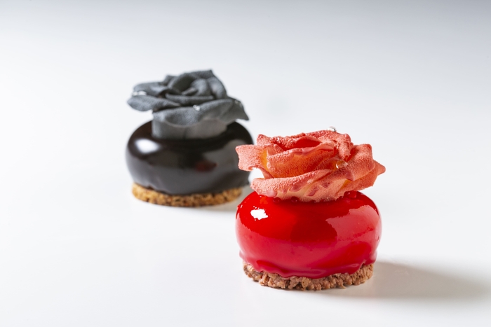 チョコレートのバラが飾られたバレンタインケーキ。赤のローズ ルージュは、フランボワーズの風味にピンクペッパーでスパイシーさを表現。ルビーチョコレートを使用したクリームが、バレンタインを甘くフルーティーに彩ります。黒のローズ ノワールは、濃厚なチョコレートの風味の中にコクのある甘さのバナナを組み合わせました。つややかで美しい漆黒が上品な印象のスイーツです。