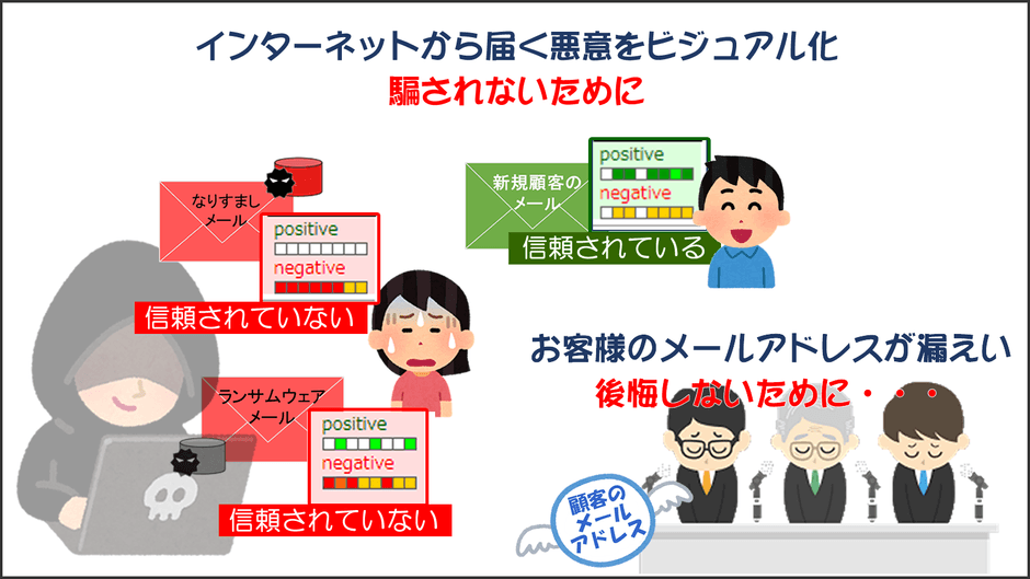 『Visual Mail Safe』は、これら危険なメールからの脅威を、目で見て、誰でも一目でわかる視覚情報にすることで、専門的な知識の無い利用者でも、危険を察知して容易に自衛することを手助けするサービスです。