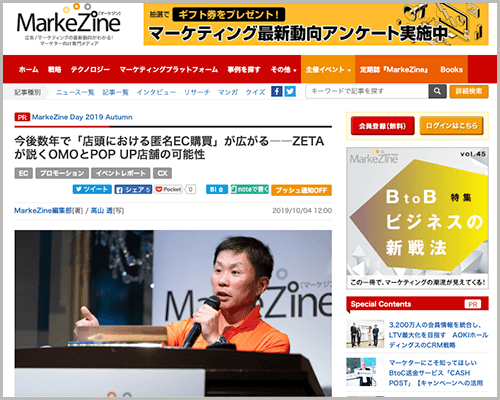 EC商品検索・レビュー・レコメンドを開発販売するコマースとCXのリーディングカンパニーであるZETA株式会社(本社:東京都世田谷区、以下ZETA)は、2019年9月12日(木)〜13日(金)に開催されたEC向けマーケティングイベント『MarkeZine Day 2019 Autumn』にて「OMOとPOP UP店舗の可能性」と題しセミナーに登壇し、その様子がセミナーレポートとして公開されました。