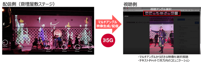 本実証は、宮城県伊具郡丸森町の「蔵の郷土館 齋理屋敷」で実施しました。複数台のiPhoneで、奥州・仙台おもてなし集団「伊達武将隊」の演武や、パフォーマンス集団「白A」の演出、宮城県丸森町太鼓集団の「旅太鼓」のパフォーマンスを撮影。撮影した映像は、遠隔にいる参加者が自身のPC等から好みの視点で見られるようにしました。映像生成、配信システムは、マルチアングル映像が体験できるSwipeVideoを利用し、ステージから配信システムへの音声映像送信に5Gを使用しました。