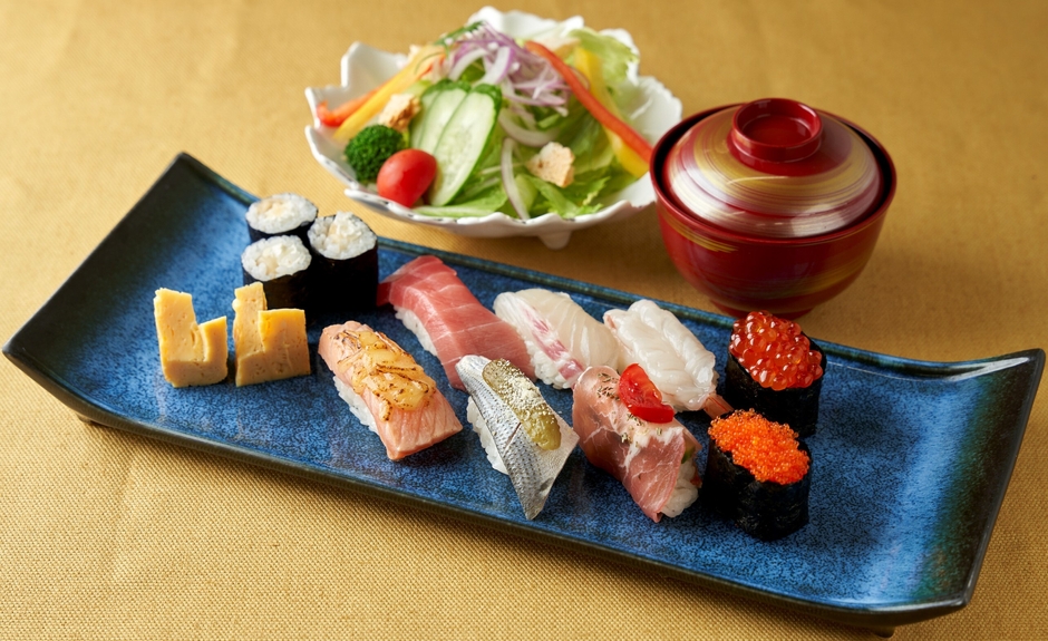 クリームチーズとガリの巻物、炙りチーズサーモンの限定ネタを楽しめる。パリパリチーズがかかったサラダも一緒に。