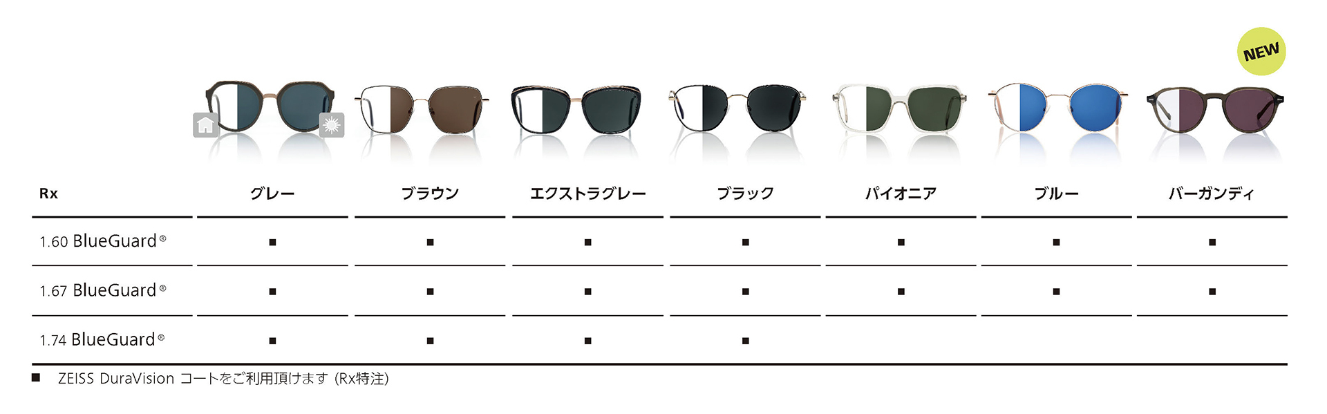 ZEISS PhotoFusion Xは、調光レンズとして、全7色のカラーバリエーションおよび屈折率1.60/ 1.67/ 1.74で展開されます。