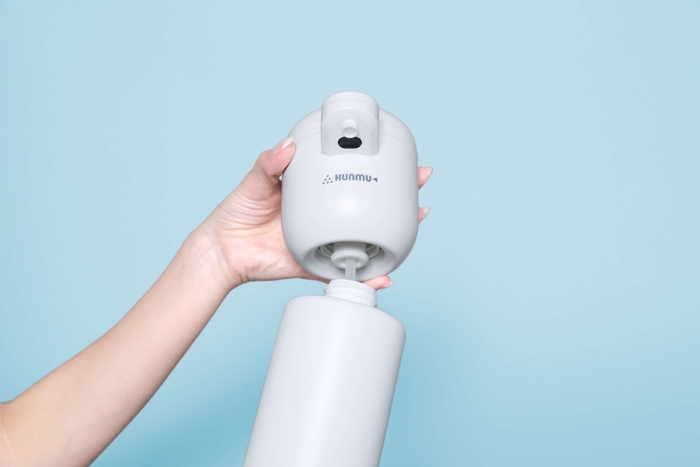 HUNMUは、お好きなボトルに取り付けて使う自動消毒器ヘッドです。市販の手動タイプの消毒液も、HUNMUを取り付けるだけで自動消毒器に早変わり。手を触れずに使えるので衛生的です。