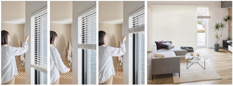 ループ状のコードを使用しない新しい操作方法を採用し、引っ掛かりや絡まりのリスクを軽減したウッドブラインドです。操作は、グリップを片手で引くだけ。引いたコードは自動で戻るため、コードが垂れ下がることもなく、すっきりとした見た目を保てます。操作グリップは子どもの手が届きにくい位置に設計され、柔らかな素材で安全性にも配慮。さらに、天然木の質感を生かしたデザインにより、環境にも貢献しながら、上質な空間を演出します。使いやすさとデザイン性を両立した、新しいウッドブラインドです。