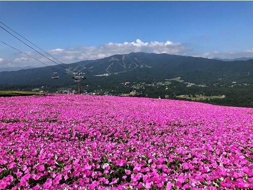 山頂の10,000m2の敷地に「4万株の桃色吐息(ペチュニア)」、別の5,000m2の敷地に「1万株のコキア」を展開。標高1,000mから広大なひるがの高原一帯を見渡しながら「花」「森」「風」「食」を満喫することができます。