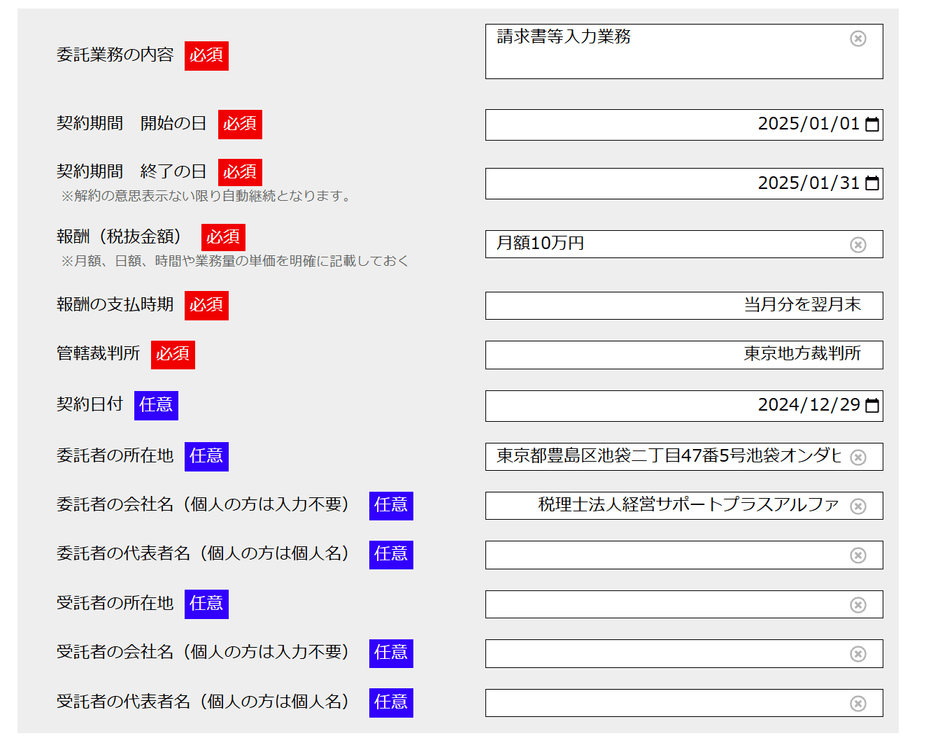 業務委託契約書を作成する際は、フォームの指示に従って情報を入力してください。その後PDF形式でダウンロードできます。