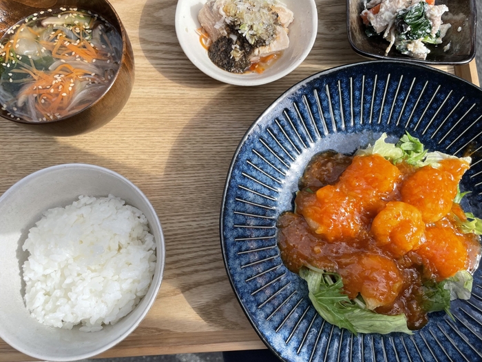 ランチは毎日日替りで、付け合わせの惣菜のバリエーションも豊富なため、通っても飽きることはありません。ナチュール素材を活かした創作和食や中華の手法を取り入れた料理など、豊富なラインナップを提供します。惣菜メニュー例としては、きのこと小松菜の白和え(白胡麻使用)、ホアジャオ・黒ゴマ・甘酢・辣油のよだれ鶏、具沢山春雨スープ。メインは四川風ピリ辛海老チリなどがあります。