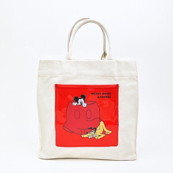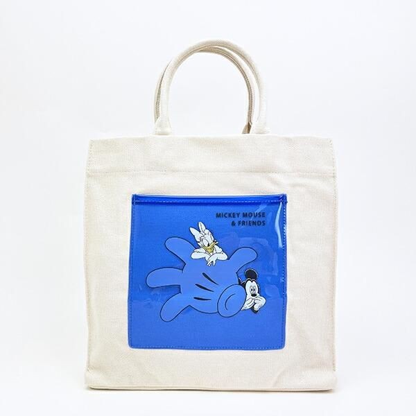 今回はディズニーキャラクターをデザインしたトートバッグをご紹介します。こちらのバッグの最大の魅力は、外側ポケットが本体とは違うビニール素材で出来ているという異素材MIXなところ!他の人とは違う、目を惹くデザインのバッグを持ちたいという方にピッタリなバッグです。