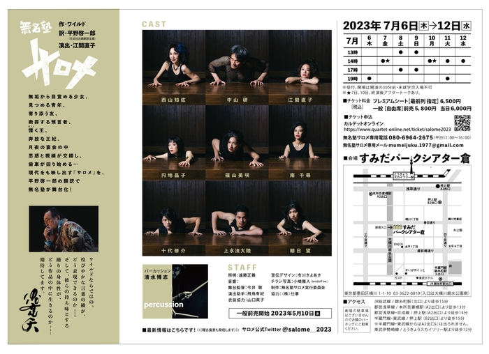 無名塾塾員による『サロメ』公演が、2023年7月6日(木)~2023年7月12日(水)まで、すみだパークシアター倉(東京都墨田区横川1-1-10)にて上演されます。チケットはカルテットオンラインにて5月10日(水)より一般前売を開始します。