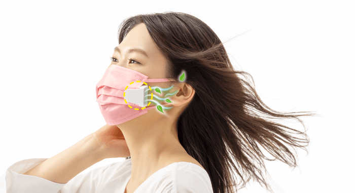 そのため、当社ではマスクを長時間着用しても『息苦しさ』や『蒸れて不快』『着用時の臭い』などを軽減できる『マスクーラー』を開発いたしました。さらに、マスク着用時に自分の好きな香りが楽しめる、アロマ機能を追加したモデルも開発しました。