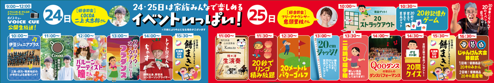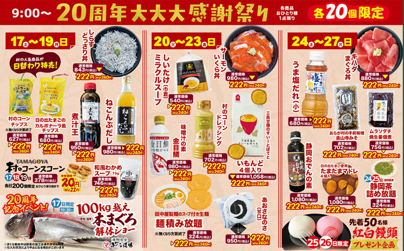 日替わりで農産物直売所の20円市や地元生産者さんの農産物大特価特売、伊豆・村の駅で大人気の商品がなんと本体価格222円の特売も。さらに、伊豆ジュニアプラスさんやCOCOAさんのライブ、トマト兄さんちゃすさんのイベントや20にちなんだイベントもたくさんご用意しております。なんと100kg越えのマグロの解体ショーや25万円相当入った20万円の福袋も登場!?20年分のありがとうの気持ちを込めた10日間をぜひお楽しみください!