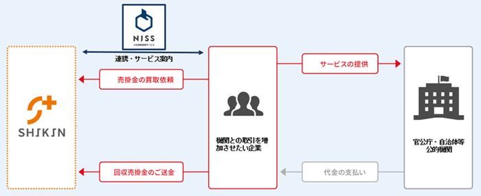 『NJSS』を導入する官公庁・自治体の入札案件に応札する企業に対して『SHIKIN+』を提供することで、入札案件に係る官公庁・自治体に対する債権を含む売掛債権などを柔軟に資金化、リスク分散し、他の公的機関の応札にも積極的に取り組めるよう支援します。