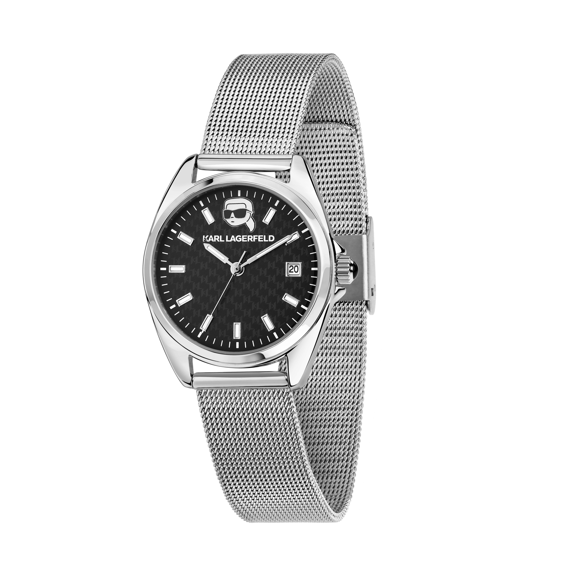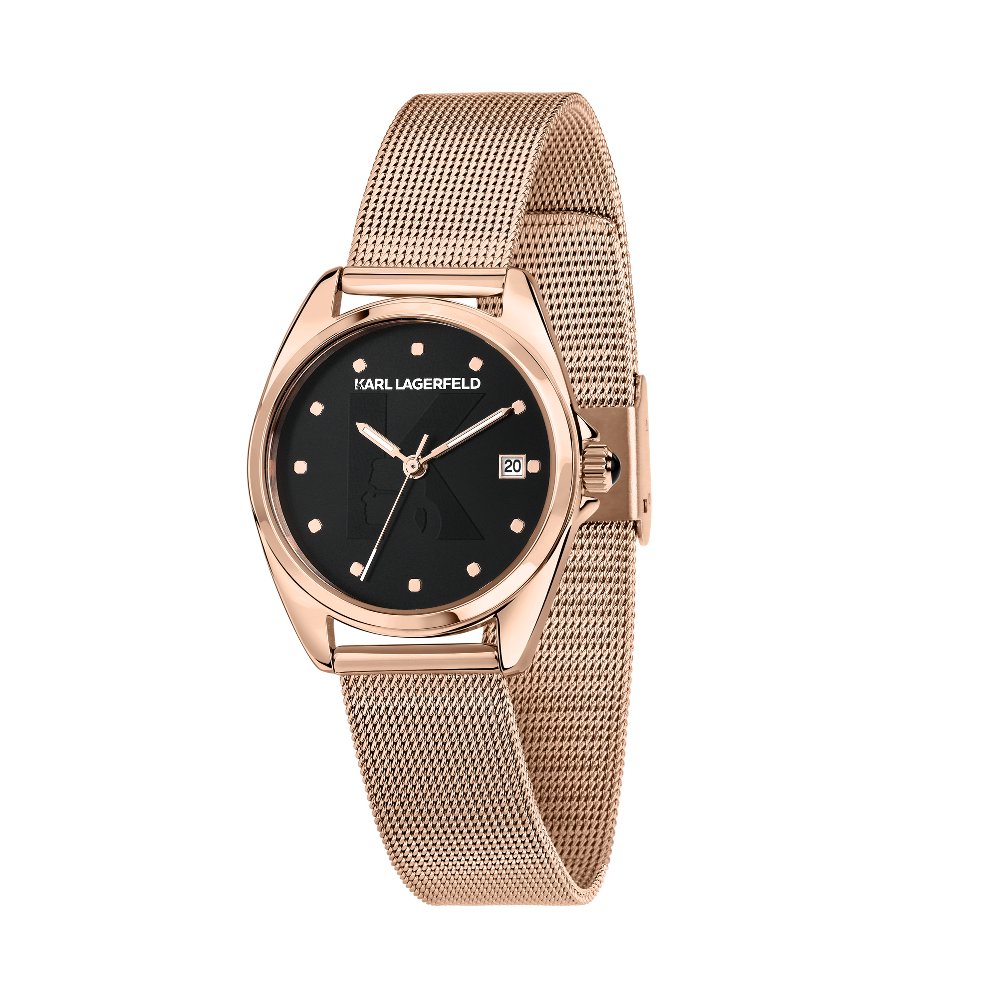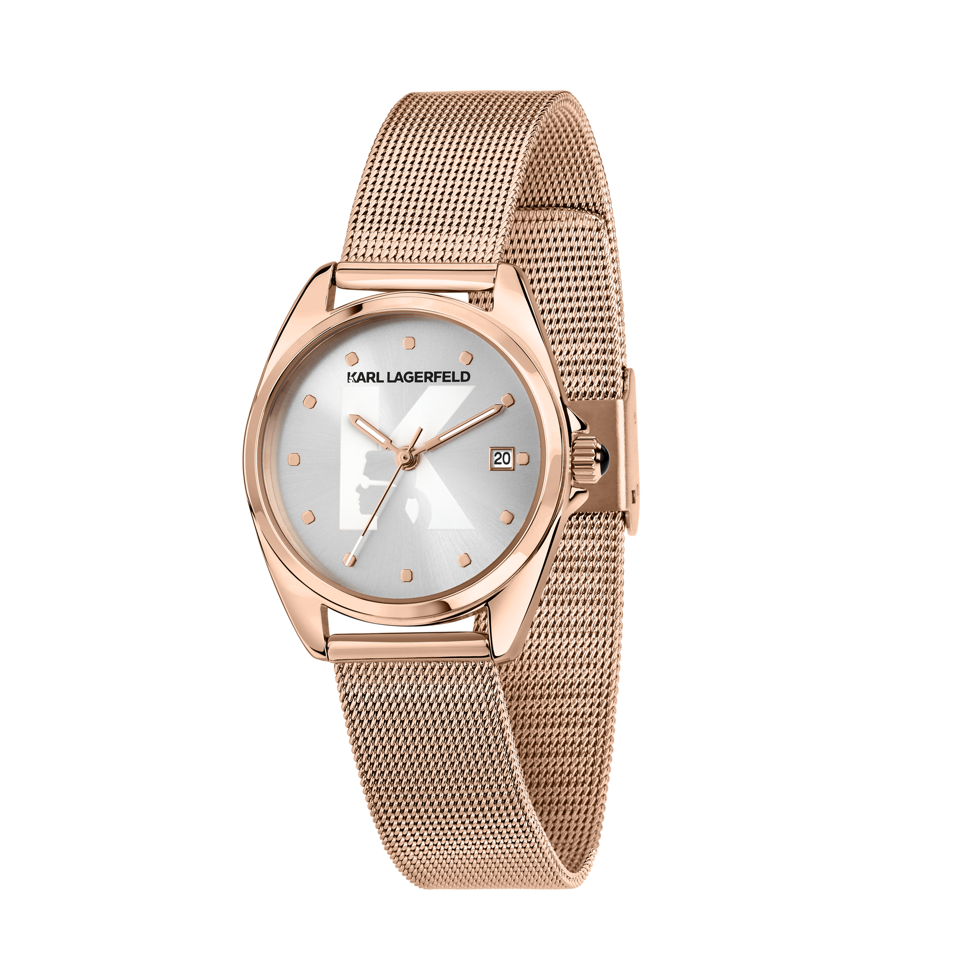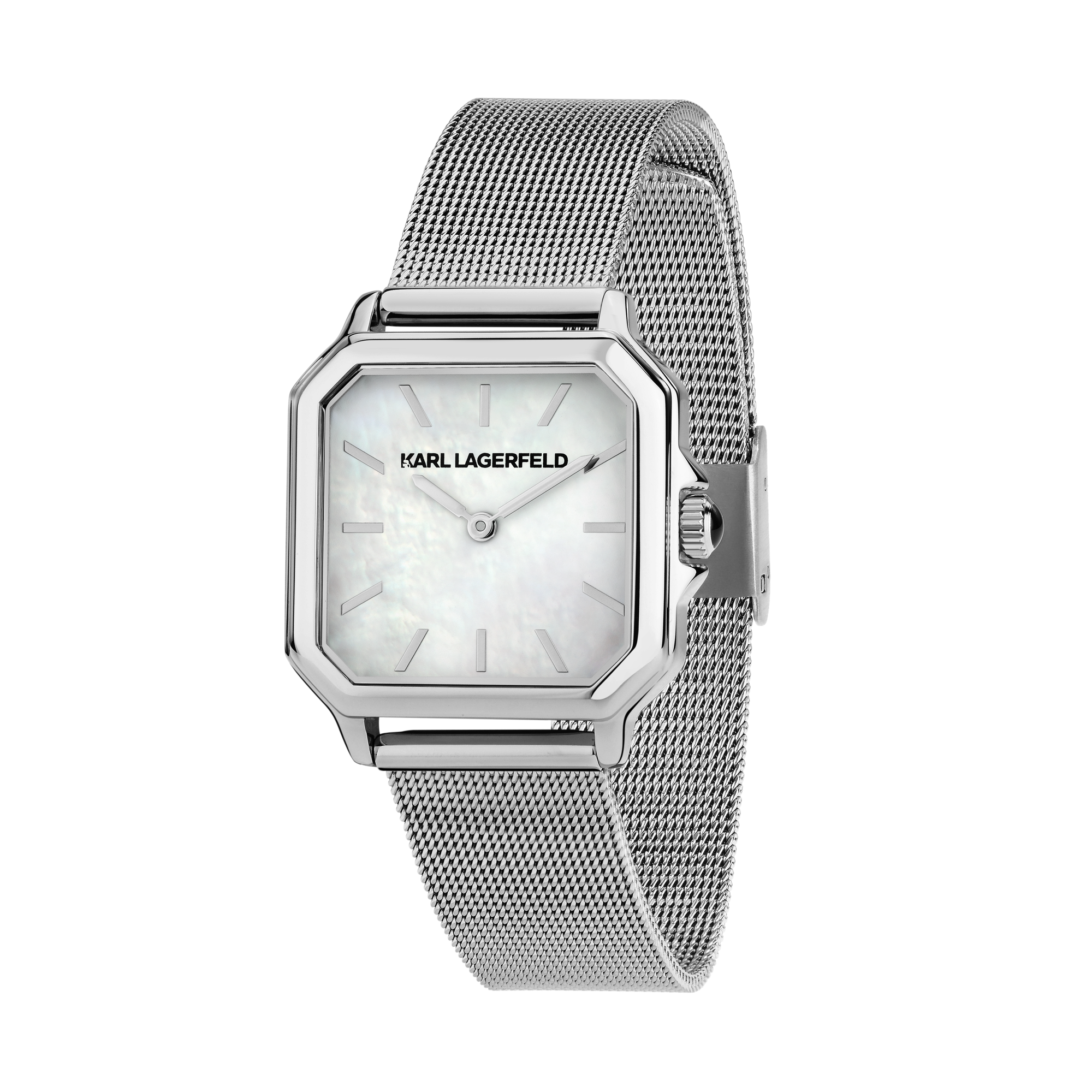 コレクションとして初めて「Karl」の手書き風ロゴを文字盤にあしらった、特別感あふれるデザイン。柔らかな光沢を放つマザーオブパール調のダイアルにエレガントなロゴが軽やかに走り、まるでジュエリーのような華やかさとアーティスティックな魅力を同時に引き立てます。さらに、ブランドとして初採用となるメッシュベルトが、上品かつモダンな表情をプラスし、より洗練された印象に仕上がっています。