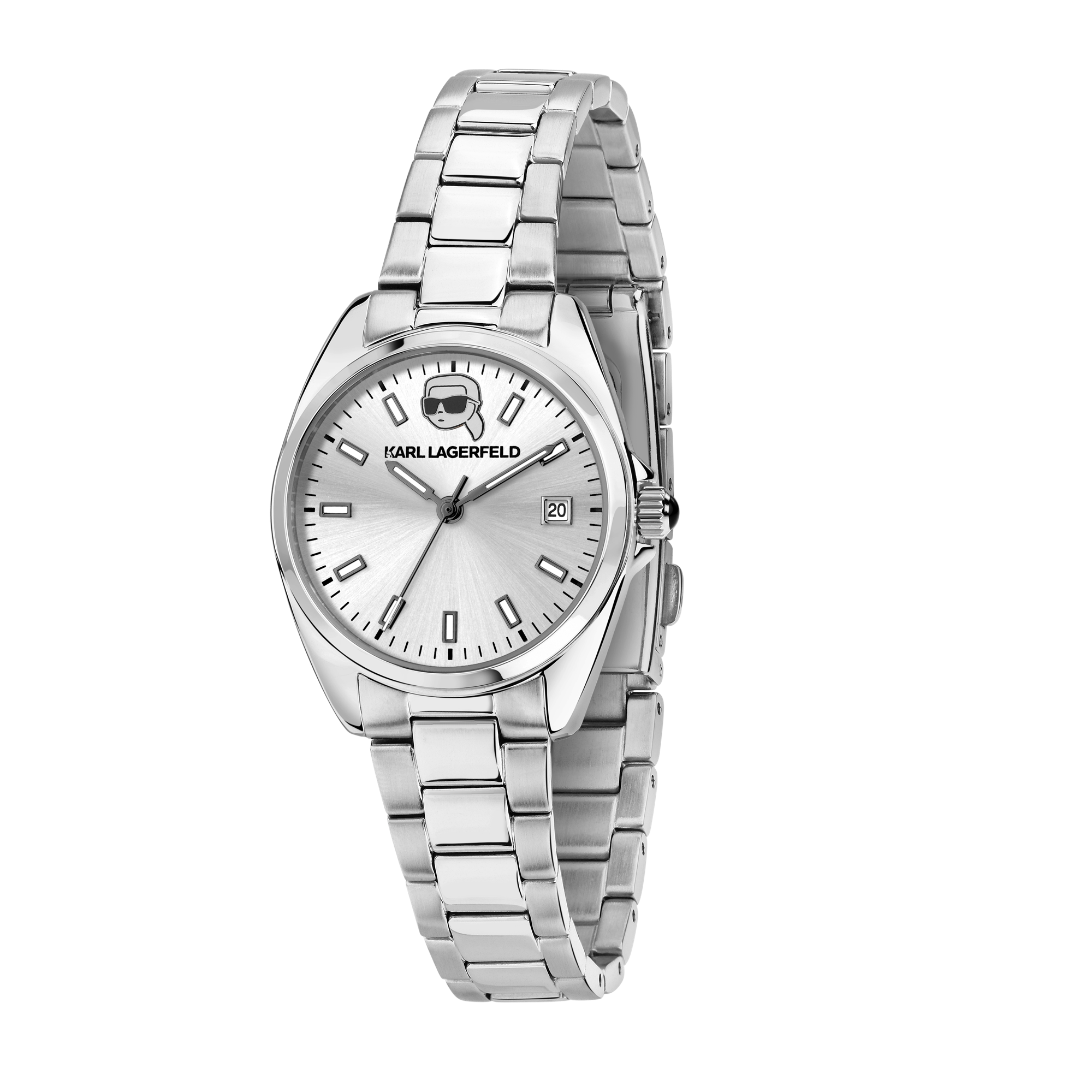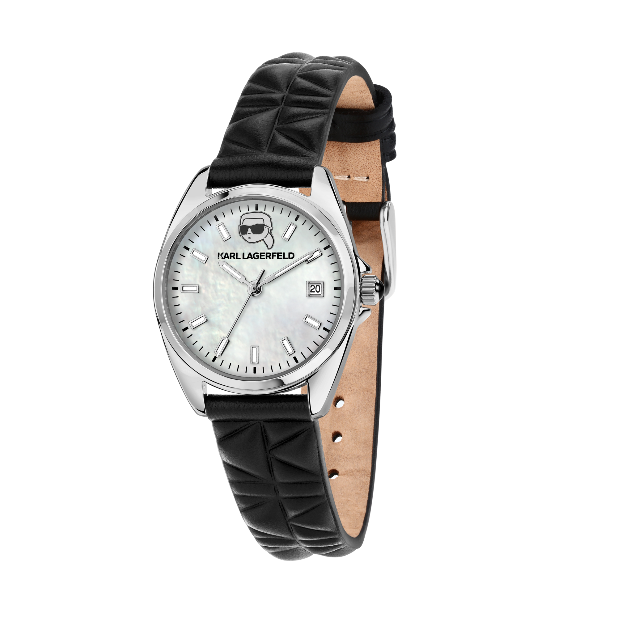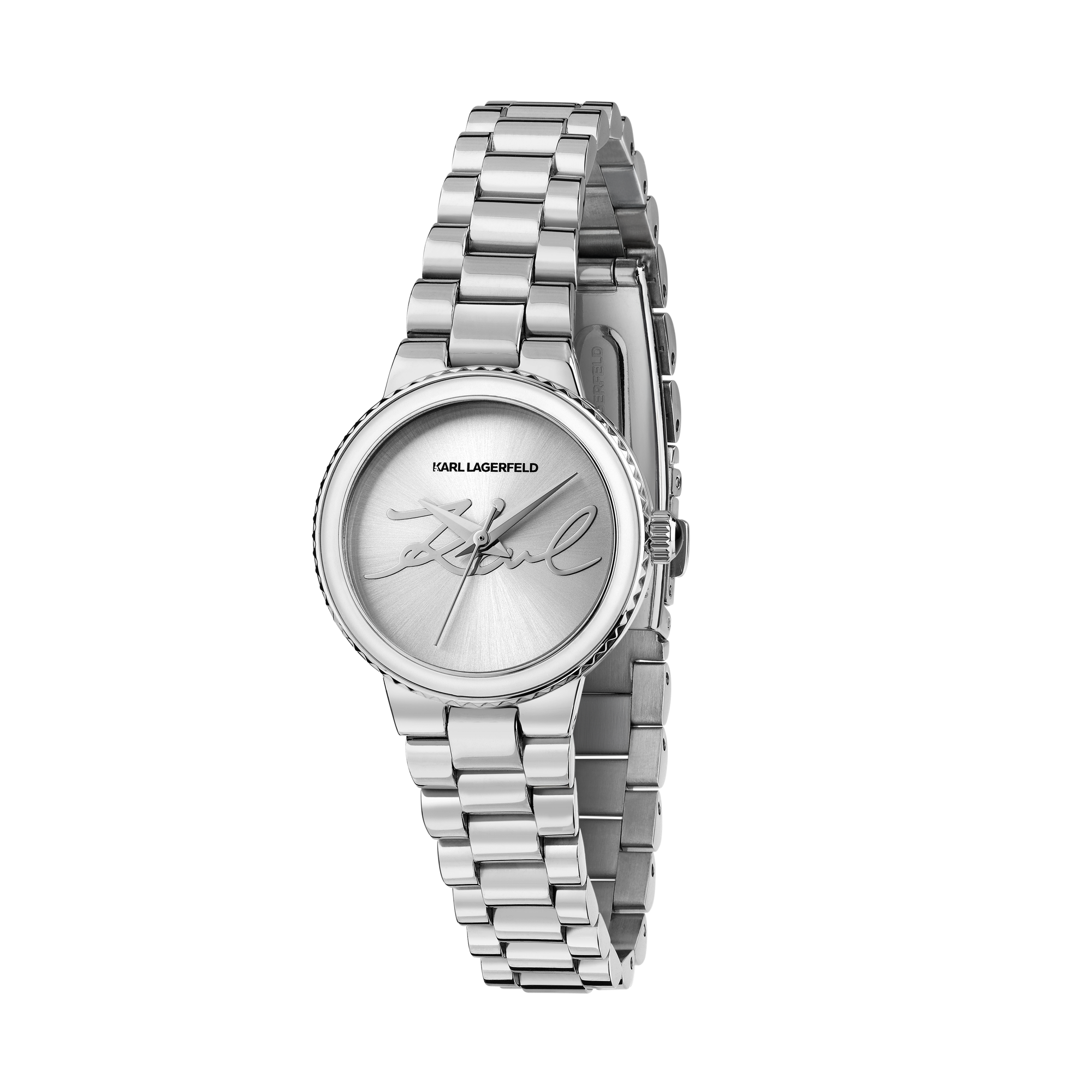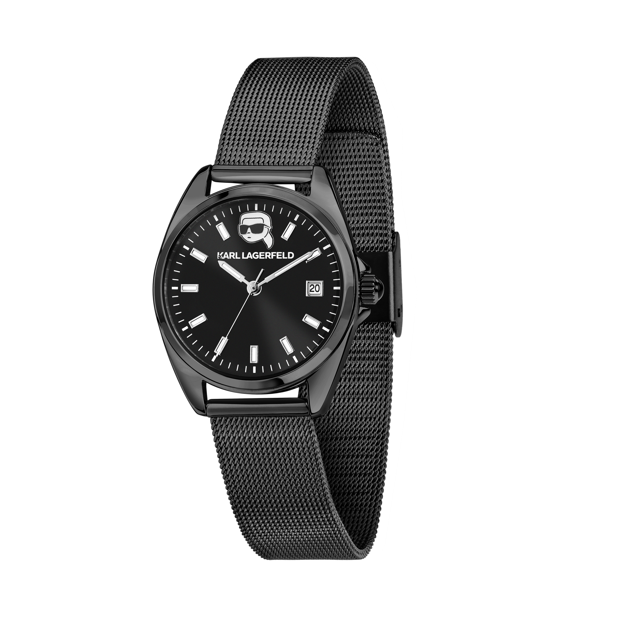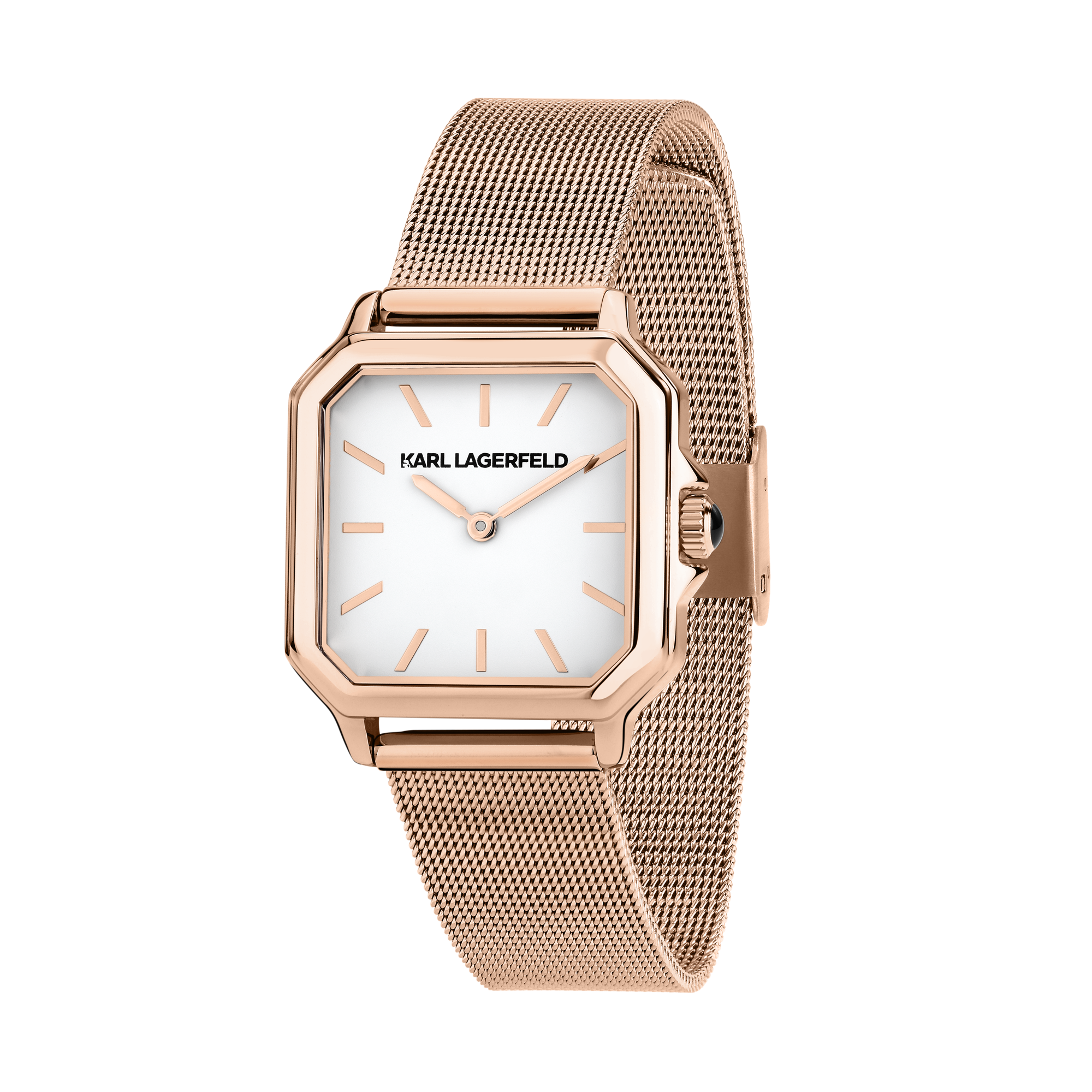 コレクションとして初めて「Karl」の手書き風ロゴを文字盤にあしらった、特別感あふれるデザイン。柔らかな光沢を放つマザーオブパール調のダイアルにエレガントなロゴが軽やかに走り、まるでジュエリーのような華やかさとアーティスティックな魅力を同時に引き立てます。さらに、ブランドとして初採用となるメッシュベルトが、上品かつモダンな表情をプラスし、より洗練された印象に仕上がっています。
