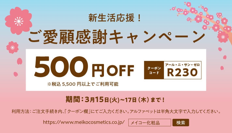 株式会社メイコー化粧品(本社:大阪市、代表取締役社長:河野 克行)は、公式オンラインショップにて商品を税込5,500円以上ご購入で、3日間限定の500円OFFクーポンを配布する「ご愛顧感謝キャンペーン」を2022年3月17日(木)まで開催いたします。