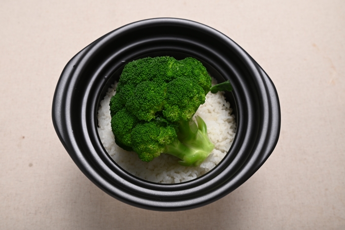 ブロッコリーは硬い部分のみ除き、茎ごと中央に置く。