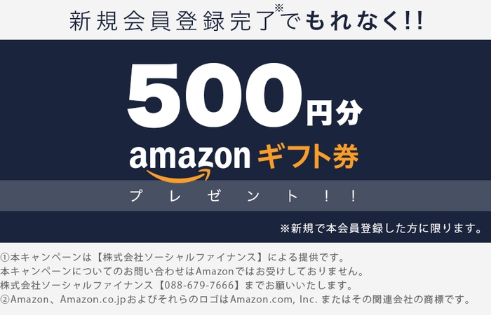 またより多くの投資家様に「SOLMINA 再エネファンド2号」を通じて、地球環境問題やSDGsへの取り組みを体験していただきたく、新規に会員登録を完了された方にもれなくアマゾンギフト券のプレゼントキャンペーンを実施させていただきます。この機会により多くの投資家様に会員登録を行っていただき、投資をご検討いただければと考えております。