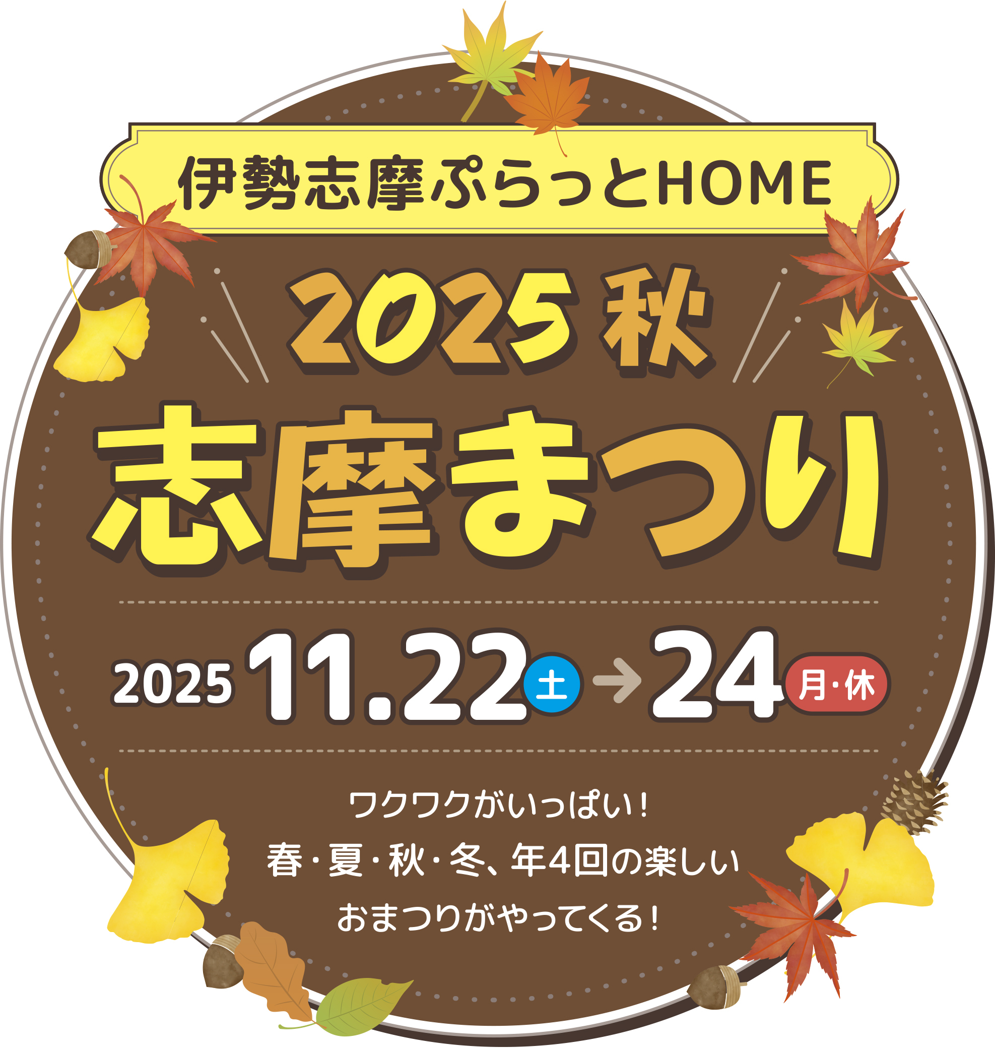 第1回目となる「志摩まつり2025秋」は、2025年11月22日(土)からの3日間、コワーキングカフェ等を備えた地域の交流拠点や観光のお客様の時間待ちスポットとして今年4月に近鉄「鵜方」駅前にオープンした「伊勢志摩ぷらっとHOME」およびアクティビティリゾート施設「志摩グリーンアドベンチャー」において開催します。