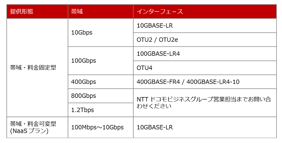 *800Gbpsと1.2Tbpsの提供インターフェースについてはNTTドコモビジネスグループ営業担当までお問い合わせください。