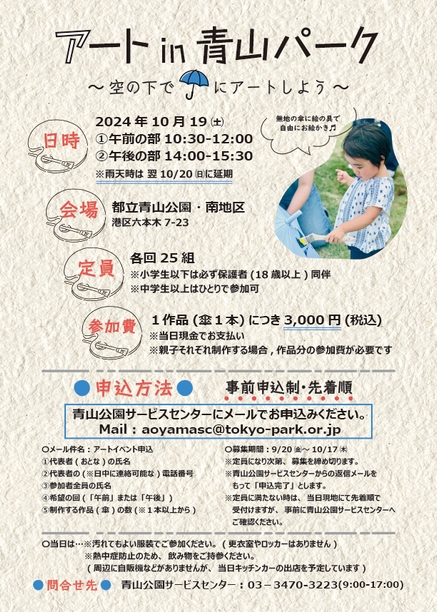 ※雨天時は翌10/20(日)に延期します。中止の場合は、当日の朝に参加者の方へメールを配信します。また青山公園公式X(旧Twitter)でお知らせします。