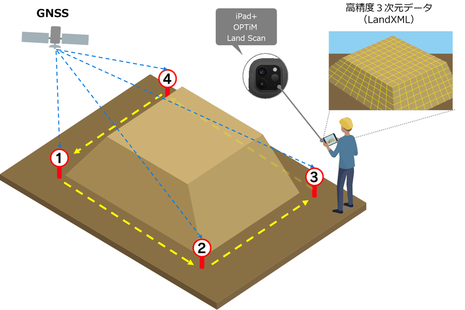 3次元データの取得が可能となるため、ICT土工を前提とした施工計画の策定や、3次元設計図などの3次元データの生成、納品が可能となり、今まで実現できなかった中小規模の現場においてもICT土工を可能とします。