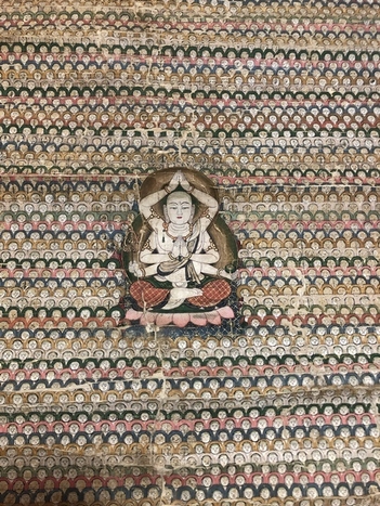 中心に描かれた「六本腕の地蔵菩薩」。地蔵菩薩がこのようなお姿で描かれた例が国内にほとんど存在しません。また周囲に小さな地蔵菩薩を1万2,000体も描くという構図はおそらく日本でこの曼荼羅一枚だけと思われます。