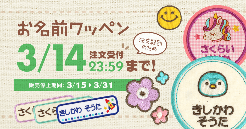 【3/14まで】入園入学に間に合わせるなら最後のチャンス!「名入れ刺繍ワッペン」注文殺到のため、受注受付を一旦休止します。