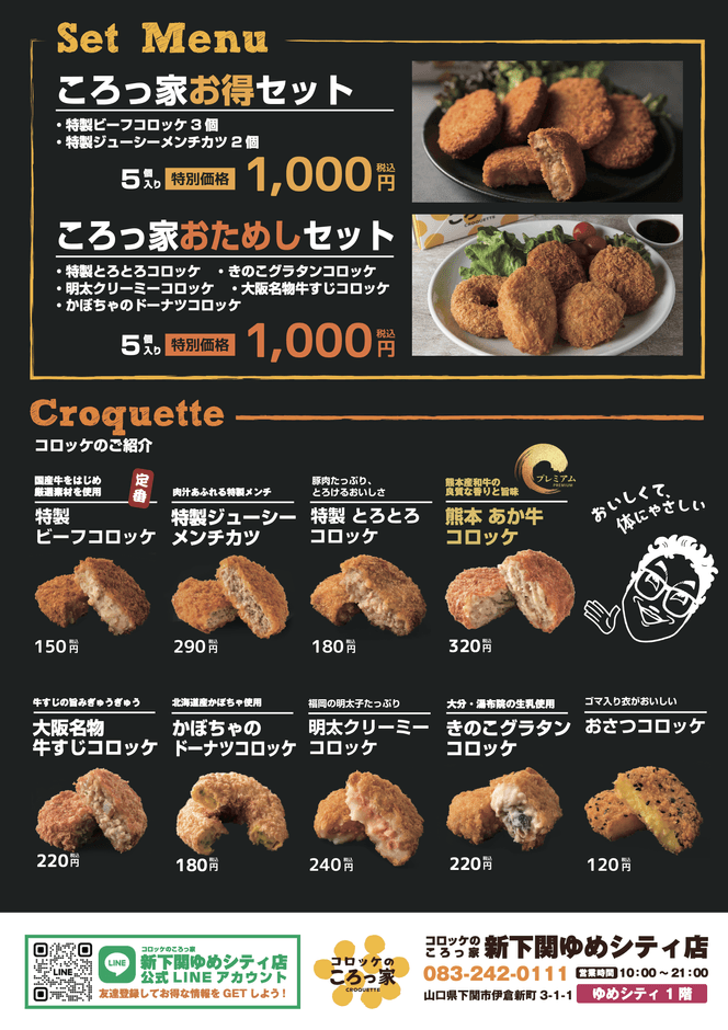 そんな今話題の『コロッケのころっ家』が、全国で42店舗目となる『新下関ゆめシティ店』を地元の皆さまに親しまれている『ゆめシティ』にオープンいたします!いま全国各地への破竹の勢いの出店により、地域ごとに盛り上がりを見せている『ころっ家』が、下関の食文化のさらなる発展に寄与出来ればと考えております。ぜひ、当店自慢の「特製ビーフコロッケ」や「特製ジューシーメンチカツ」の他、全部で9種類のコロッケを取り揃えた、他店では味わえないオリジナルティあふれるコロッケをぜひ一度ご賞味ください!