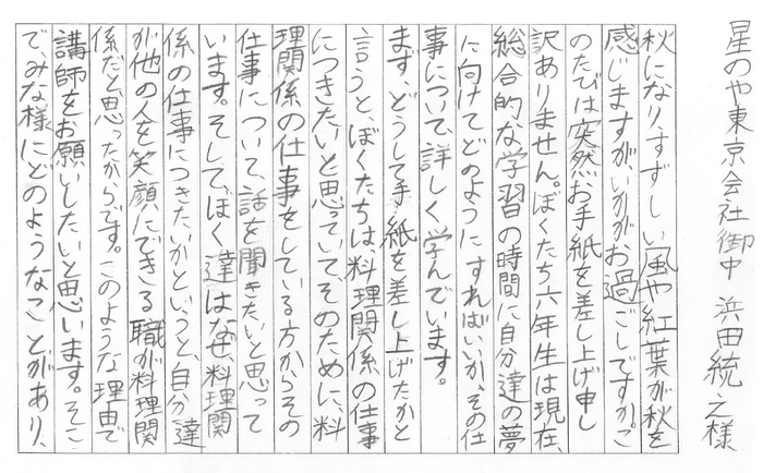 大田区立池上第二小学校では年に一度、6年生に向けて「ドリームプロジェクト」というキャリア教育を実施しています。子供たちが将来就きたい職業に携わっている様々な分野の講師を招き、直接話を聞いたり、質問をしたりすることで、その仕事の楽しさや難しさ、やりがいなどを知り、理解を深めます。今回、料理人の仕事に興味を持っている6年生の児童より、料理長・浜田に宛てて、講師を依頼する直筆の手紙が送られてきたことがきっかけで、初めて参加しました。