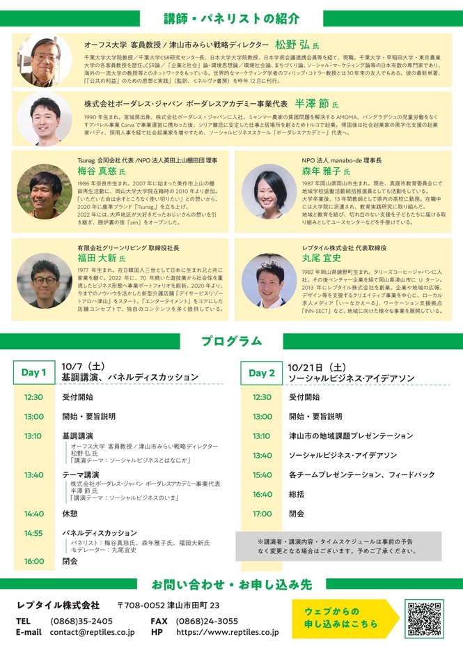 レプタイル株式会社(所在地:岡山県津山市田町23、代表取締役:丸尾 宜史)は、2023年10月7日(土)および21日(土)に、地域の社会課題をビジネスで解決する“ソーシャルビジネス”を学び、実践するための特別講演・アイデアソンを開催します。